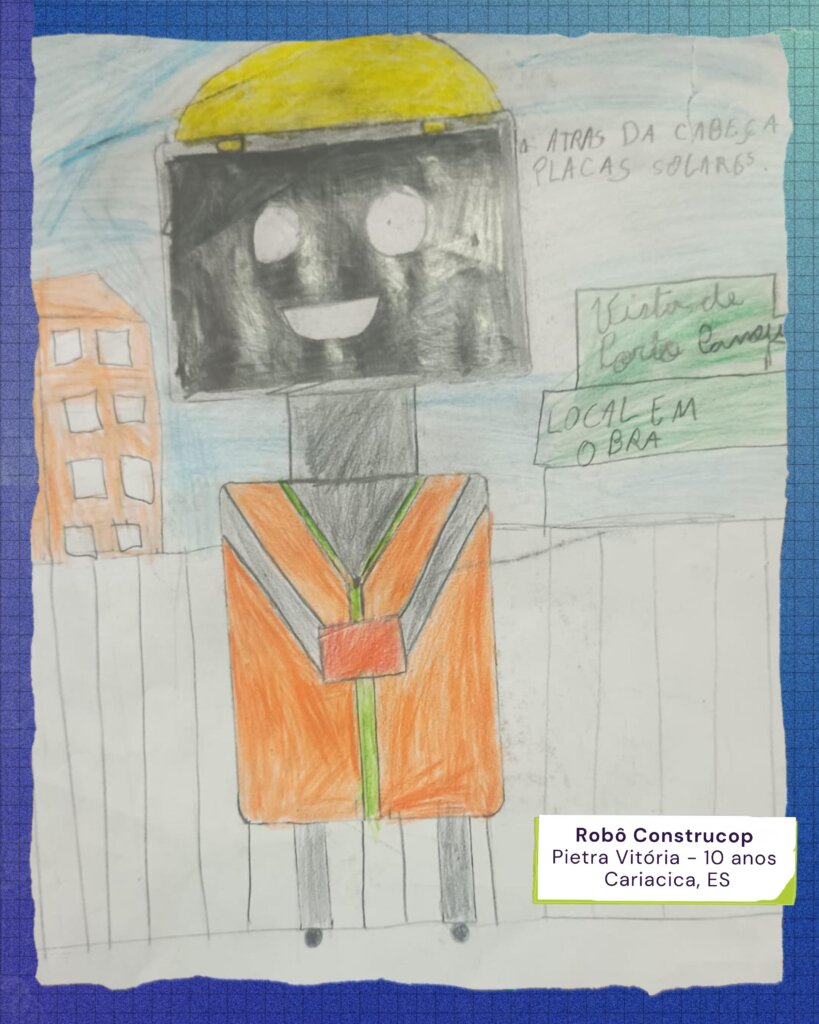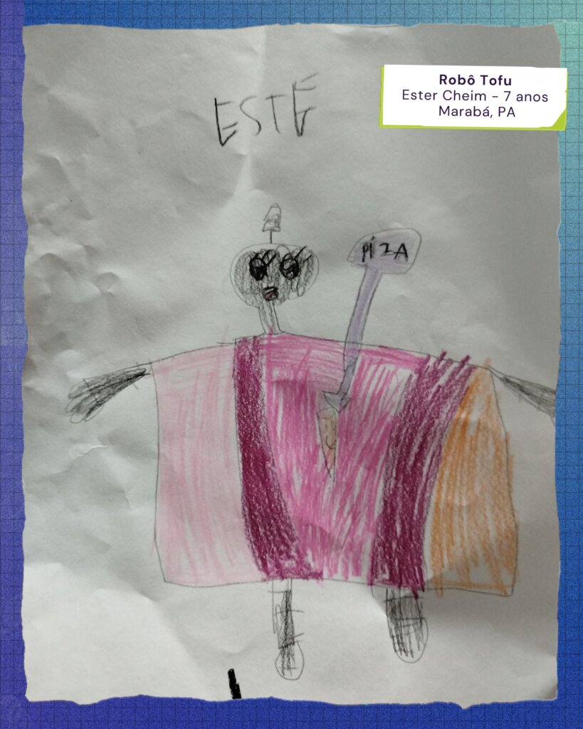 A Professora Sirleny ainda detalha o processo de aprendizagem. “Eles primeiro imaginaram o que este robô poderia fazer, as suas funções… e, por fim, a ideia de como seria o resultado, organizando a sequência de construção do desenho. Foi uma forma artística e divertida de desenvolver habilidades do século XXI, integrando arte, ciência e tecnologia, alinhados às orientações da BNCC.”