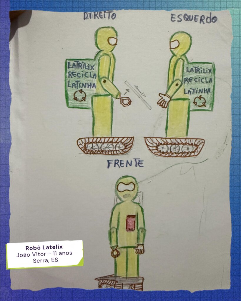 Latelix (João Vitor, 4º ano): Um robô auxiliar para a reciclagem, equipado com garra e GPS, pensado para ajudar idosos na coleta de latinhas e geração de renda.