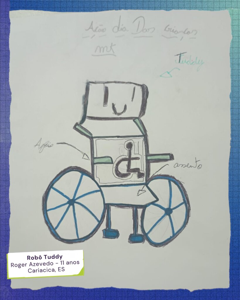 Tuddy (Roger Azevedo, 5º ano): Um robô que no ambiente escolar auxilia para melhor acessibilidade de Pessoas com Deficiência (PcD).